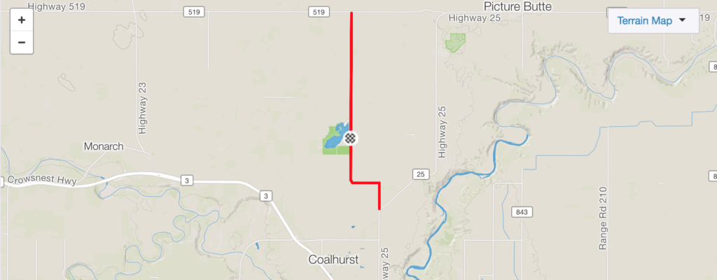 Start at the park entrance on the northbound side of the road going just short of the HWY519 tee intersection. Turn around after the pylon in the center of the road 100 meters before the intersection (do not continue on to turn at the intersection). After the turn around go south past the park entrance, then right at the next intersection then turn around at the pylon just before the HWY25 (Picture Butte HWY) , Then back toward Park Lake where the finish will be for the 25km course. The 40km riders will keep going north again to the HWY519 tee, turn around and ride back to Park Lake finishing on the southbound side of the road.